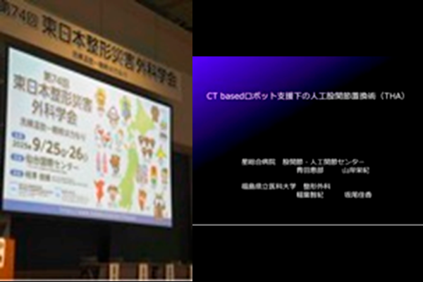 第74回東日本整形災害外科学会でロボットやAR,XRのシンポジウムがあり、ロボットによる人工股関節置換術について青田医師が発表しました。